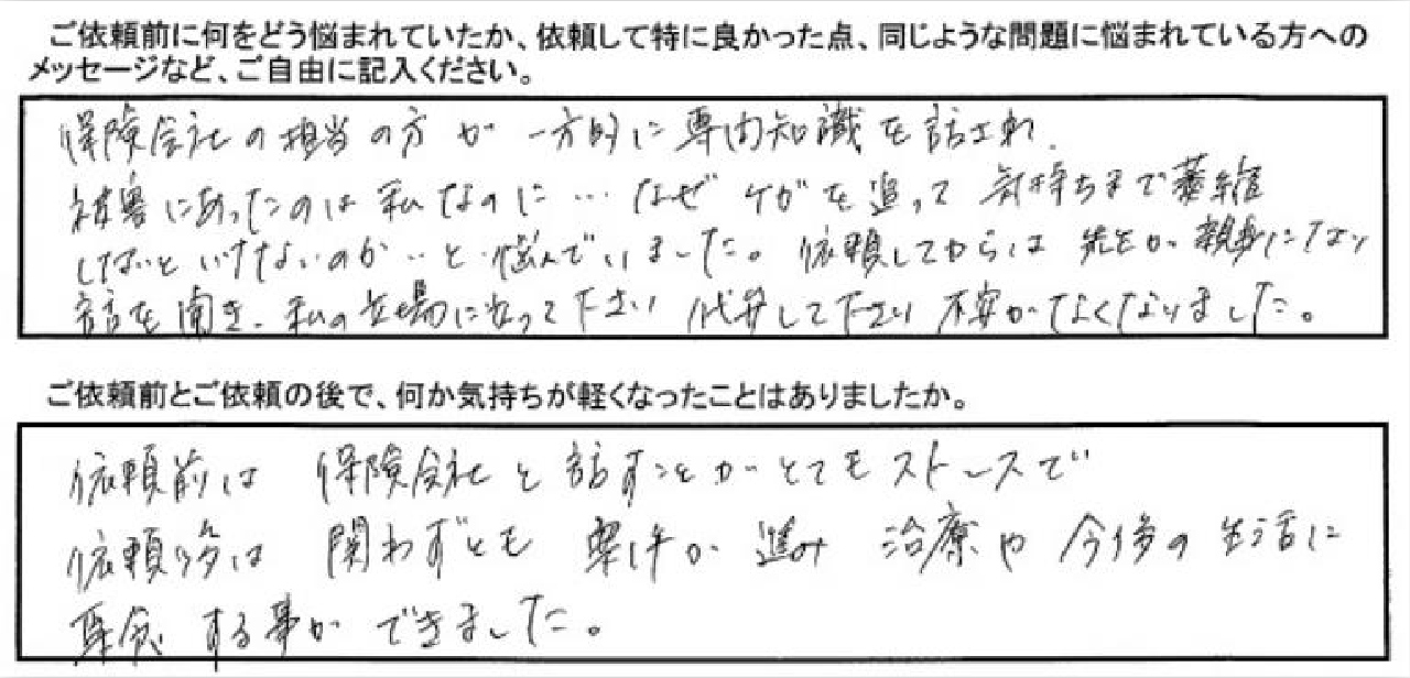 「苦痛」「不安」「面倒」な保険会社との対応は、当事務所にぜひご依頼ください。